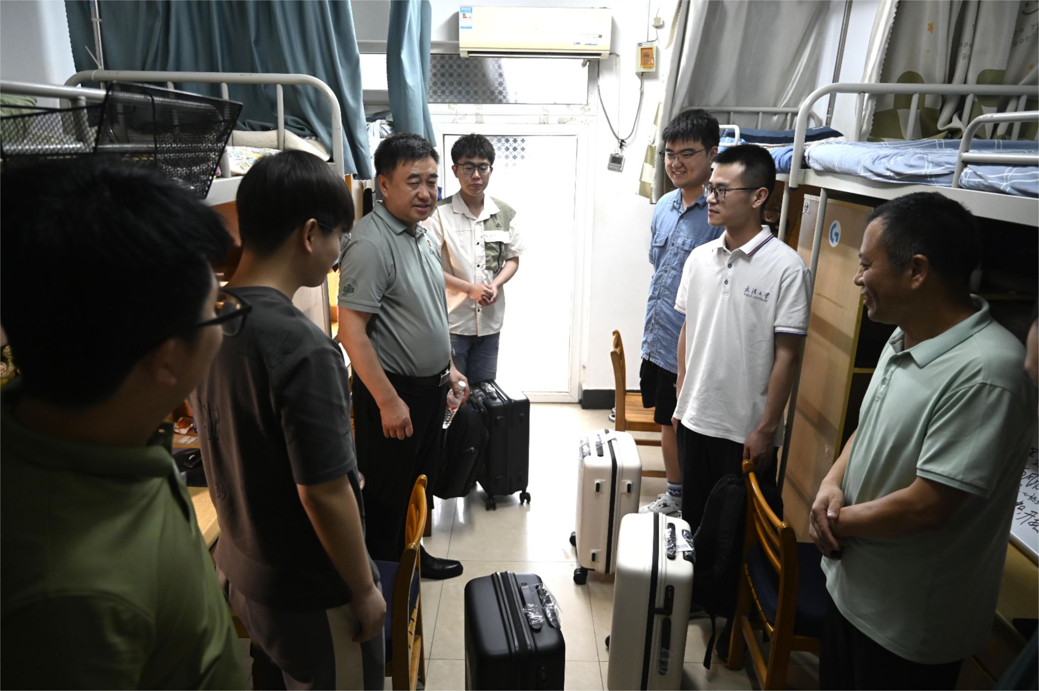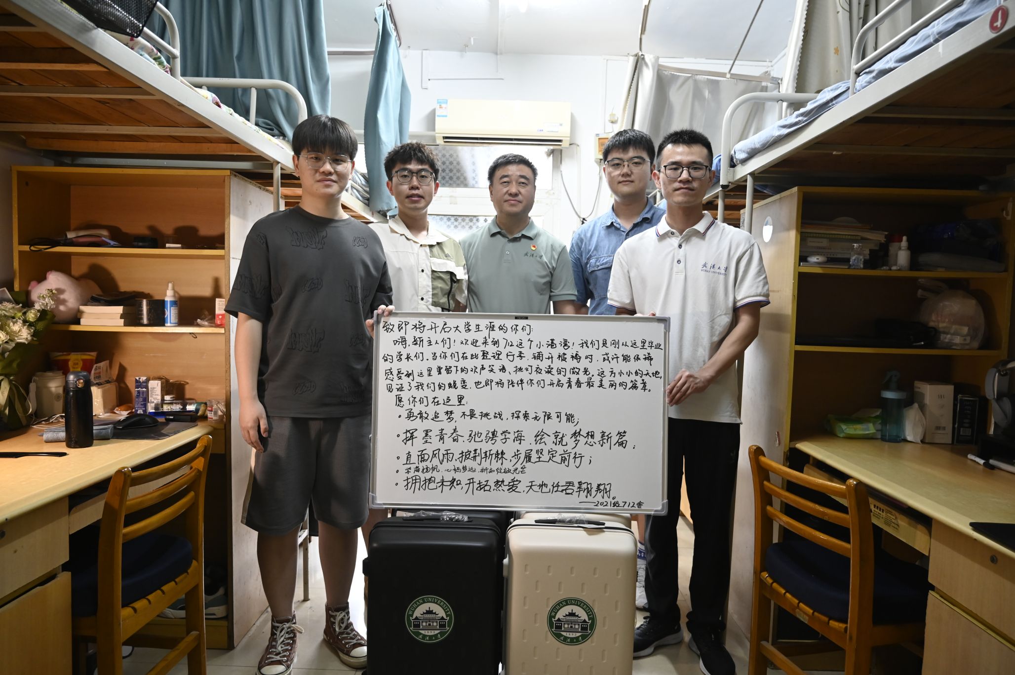 在走访学生宿舍过程中,屈文谦亲切地与毕业生交谈,仔细询问同学们的毕业去向,对毕业生们所取得的成绩表示祝贺,并为他们送上了学校精心准备的毕业纪念品,表达了母校对同学们深深的祝福与期许。信息学部16舍702的4位同学全部成功推免,连续四年获评“裸体直播 文明寝室”,连续两年获评“裸体直播 文明寝室标兵”,屈文谦一行对寝室文化建设给予充分肯定,指出了宿舍氛围和风气的重要性。
