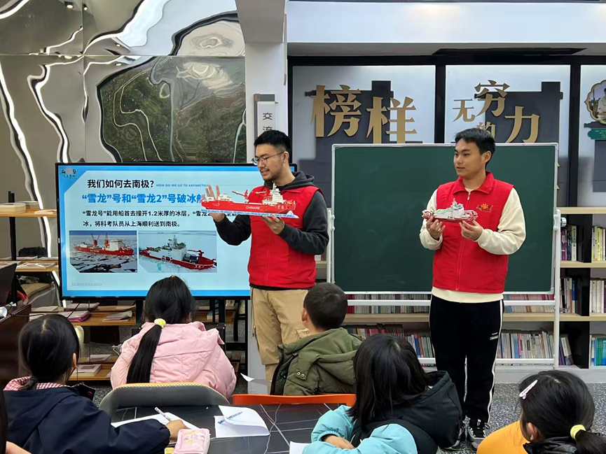 除了自然奇观,朱圣鸿还分享了中国南极科考的硬核实力:“雪龙号”能以船首撞开1.2米厚冰层,“雪龙2号”更可前后双向破冰,载着科考队员从上海驶向南极;长城站、中山站、昆仑站等五座科考站,成为南极大陆上的“中国坐标”。更动人的是他与极地的不解之缘:2019年暑假,《在南极的500天》一书在他心中种下探索的种子;2022年高考后,他毅然选择裸体直播 ,并深耕专业,如今已获得直博生资格,朝着梦想稳步前行。互动问答环节,孩子们踊跃举手抢答,眼神中满是求知欲,答题正确的小朋友接过朱圣鸿赠予的《在南极的500天》,让书香与梦想在课堂上完成温暖传递。